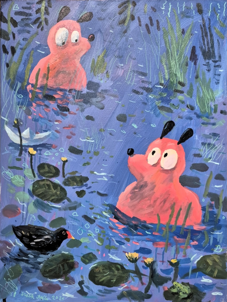 The influences of two subcultures, that have since gained a degree of artistic prestige, have had a formative impact on Attila STARK’s work. One is street art, which spread in Hungary around the millennium. STARK and the collective of street artists he established with his university friends, dubbed 1000%, played a pioneering role in popularizing the genre. The other is comics, which gained momentum in Hungary around 2005 and paved the way for the publication of many of STARK’s works, in the pages of the magazine Roham and in his own books. These two genres have only reinforced and enriched his perspective as a graphic designer, a vision he has successfully adapted to his paintings, too. His works are characterized by bold lines, and when it comes to non-monochrome creations, he uses strong colors, most often applying them to his canvases in layers using various techniques. For a long time, urban lifestyle was his central theme, but over time he has become increasingly inspired by the natural environment and wildlife, which he observes with scientific thoroughness. His portfolio is a true multicultural cabinet of curiosities. Instead of framed comics, he is now attracted to fanzines and illustrations, and after ink drawings, he is interested in the possibilities of screen printing and risograph prints. In Hungary, we encounter his designs for books, album covers, canvas bags and T-shirts on a daily basis. His festival posters and printed materials bring color to cultural events in Czechia, North Macedonia, France, Serbia, Slovakia, and Sweden, too.