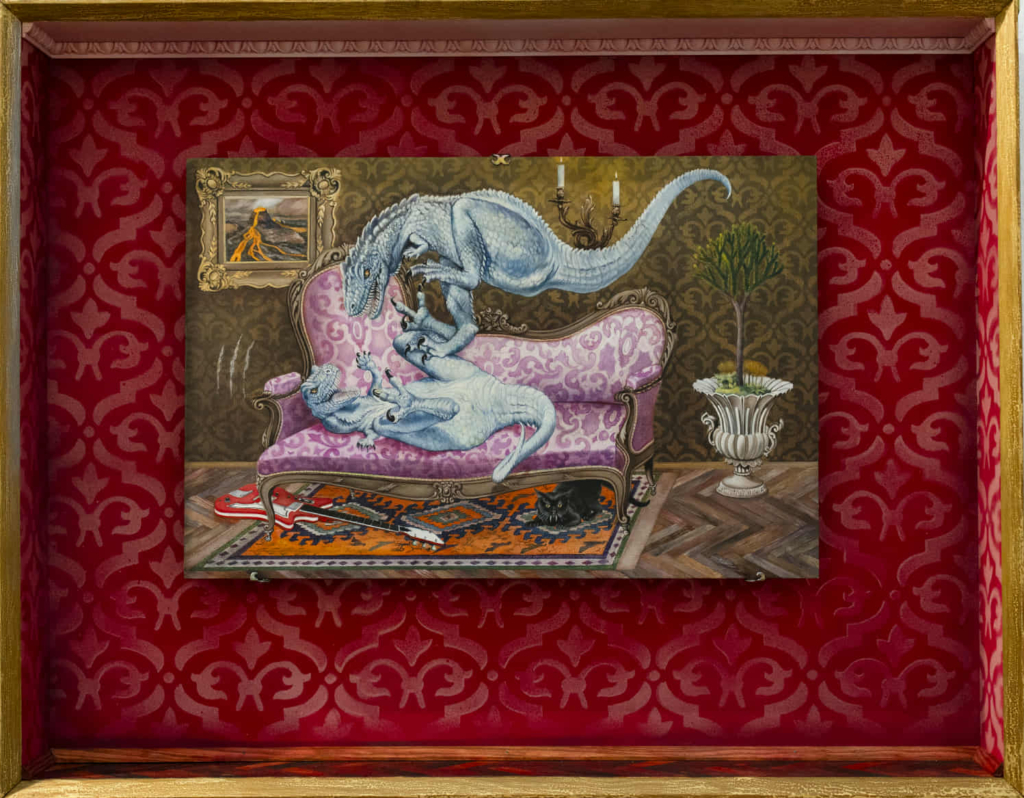 While Ágnes GAZDAG’s works can be interpreted as good-natured ribbing, KARÁCSONYI’s interpretations are practically trolling. With his provocative, sarcastic humor, he breathes new life into completed works, making excellent use of kitschy porcelain and tapestries, but he doesn’t shy away from children’s toys either. Lately, he has been inspired by prehistoric predators: dinosaurs. Like many others of Generation X who grew up behind the Iron Curtain, it was not Jurassic Park but the illustrations of the Czech painter Zdenek Burian (with his book Life Before Man) that put ‘dragons’ into his head.