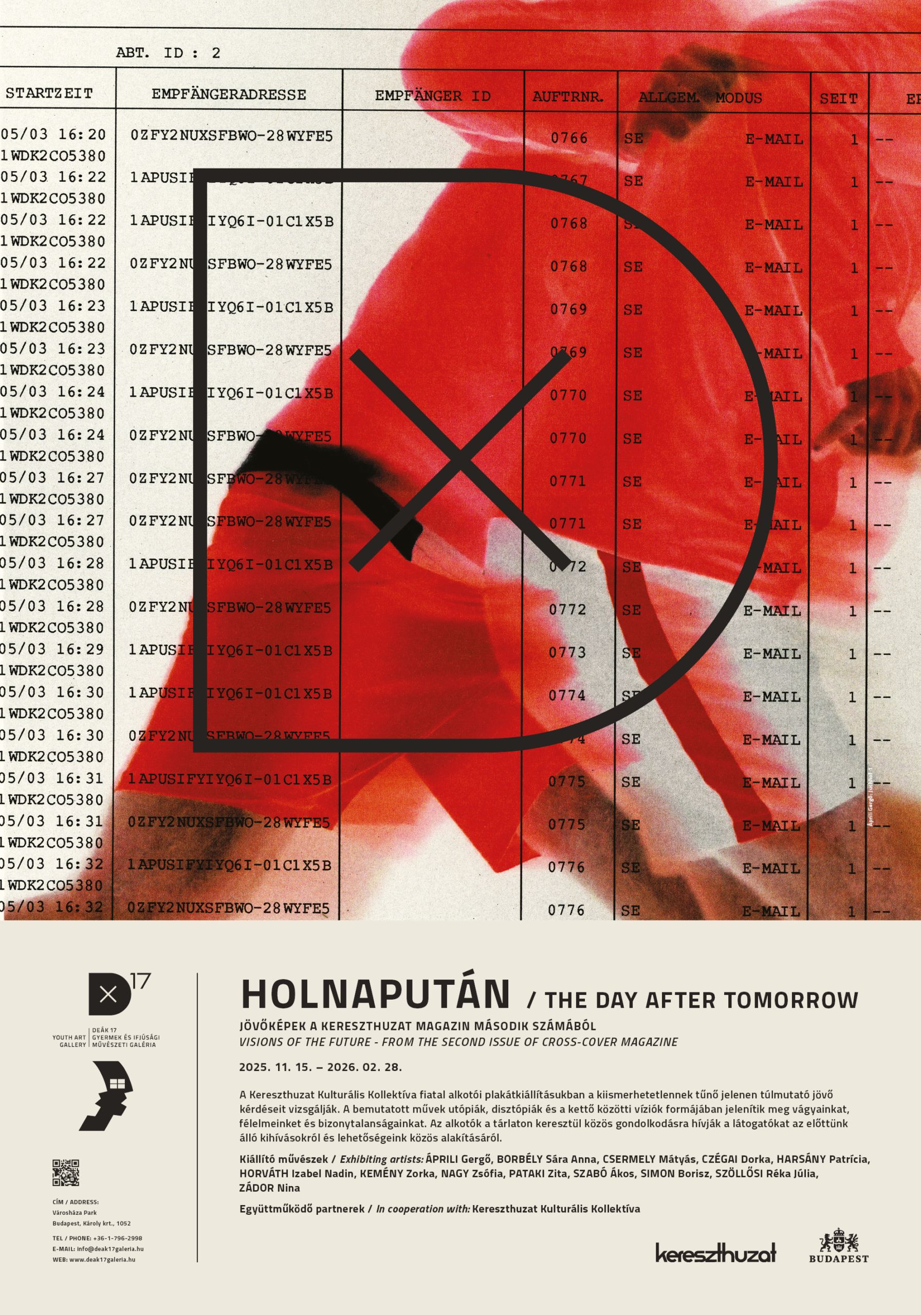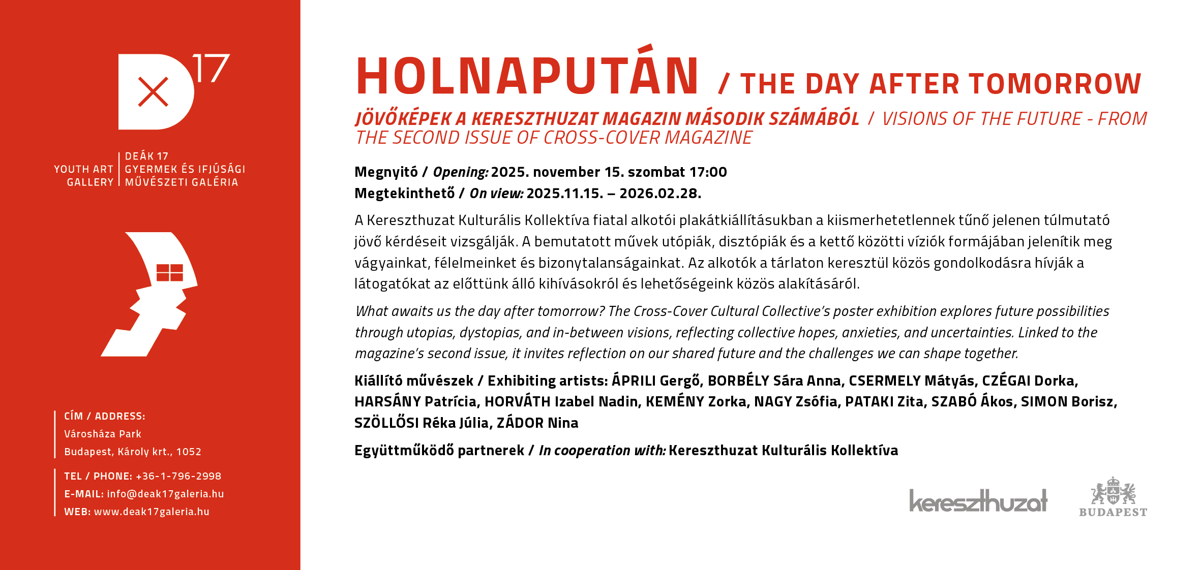 A Kereszthuzat Kulturális Kollektíva fiatal alkotói plakátkiállításukban a kiismerhetetlennek tűnő jelenen túlmutató jövő kérdéseit vizsgálják. A bemutatott művek utópiák, disztópiák és a kettő közötti víziók formájában jelenítik meg vágyainkat, félelmeinket és bizonytalanságainkat. Az alkotók a tárlaton keresztül közös gondolkodásra hívják a látogatókat az előttünk álló kihívásokról és lehetőségeink közös alakításáról.