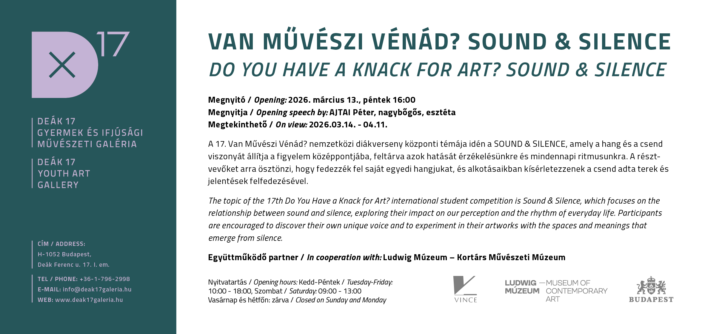 A 17. Van Művészi Vénád? nemzetközi diákverseny központi témája idén a SOUND & SILENCE, amely a hang és a csend viszonyát állítja a figyelem középpontjába, feltárva azok hatását érzékelésünkre és mindennapi ritmusunkra. A résztvevőket arra ösztönzi, hogy fedezzék fel saját egyedi hangjukat, és alkotásaikban kísérletezzenek a csend adta terek és jelentések felfedezésével.